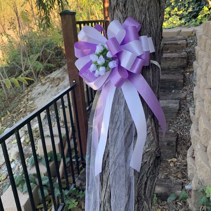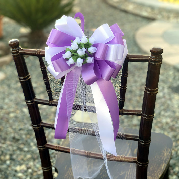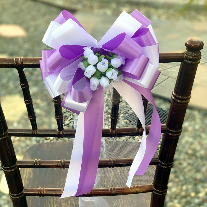 Lavender and White Wedding Pull Bows with Tulle Tails and Rosebuds - 8" Wide, Set of 6