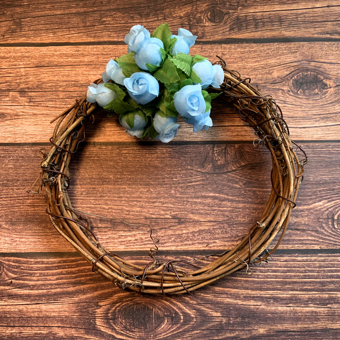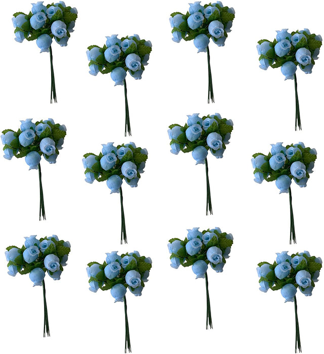 • 12 faux silk polyester Light Blue Rosebud mini bouquets, with 3" long, bendable green stems and leaves for all your Arts, Crafts and DIY needs