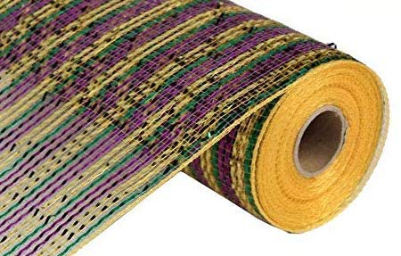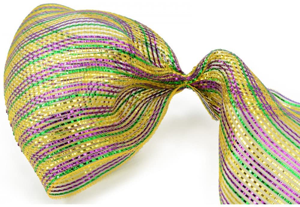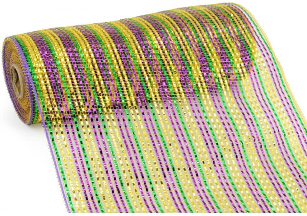 - Bright Green, Vivid Gold and Royal Purple stripes with metallic foil inlay for added sparkle makes this festive deco mesh an ideal addition to any set of Holiday decorating supplies – Perfect for Bow, Wreath, Swag, Garland, Gift Basket Makers to prepare for that Masquerade Party!