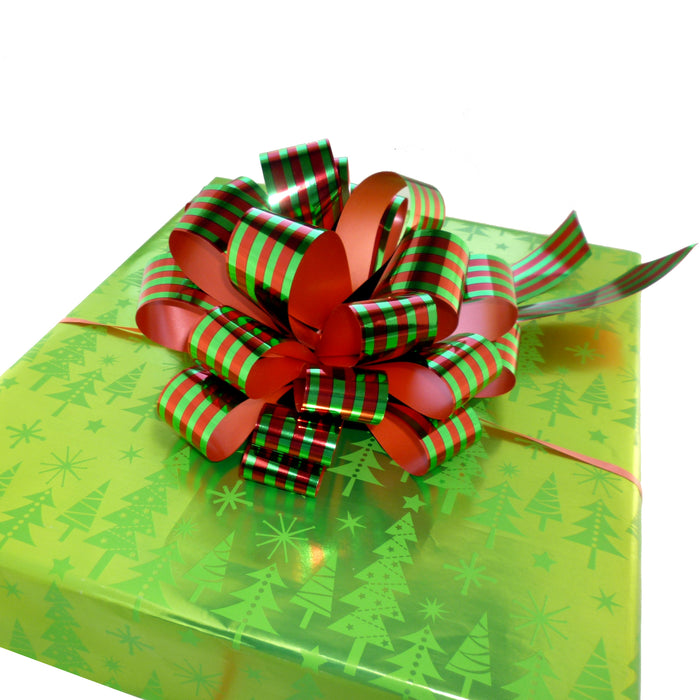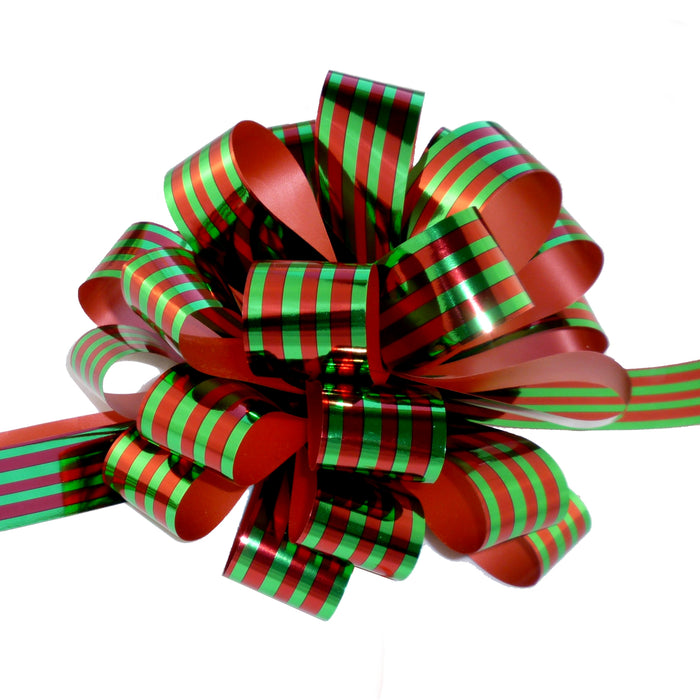 Metallic Red & Green Striped Pull Bows - 8" Wide, Set of 6