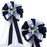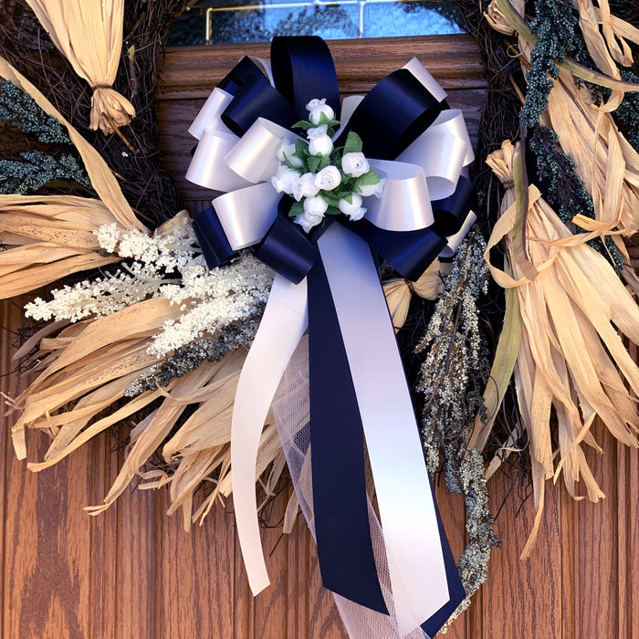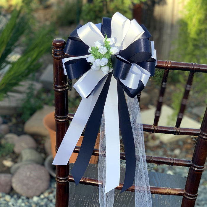 Navy Blue and White Wedding Pull Bows with Tulle Tails and Rosebuds - 8" Wide, Set of 6