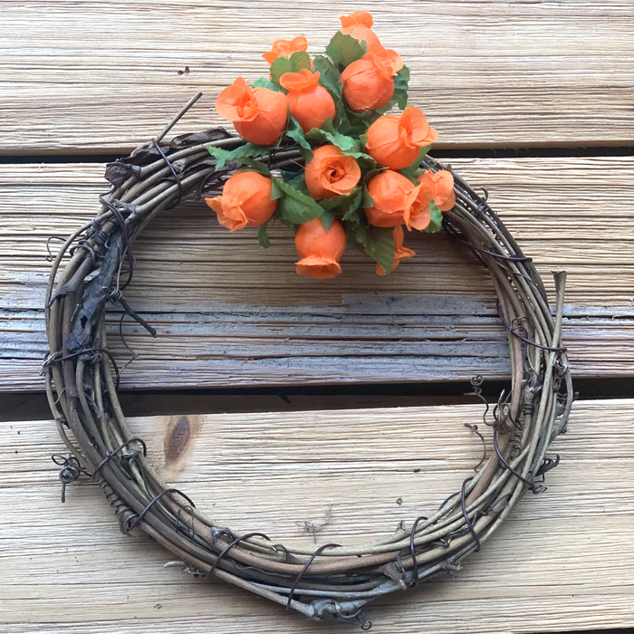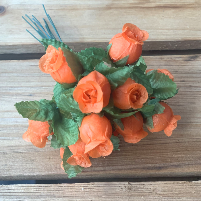 12 faux silk polyester Orange Rosebud mini bouquets, with 1.75" long, bendable green stems and leaves for all your Arts, Crafts and DIY needs