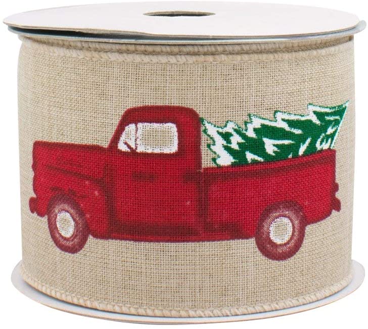 - Ribbon for Gift Wrapping - Bright Red Antique Pickup Truck with Christmas Tree ribbon wire edges in a roll 2.5 inch wide by 10 yds for all your holiday craft and Christmas Decorations