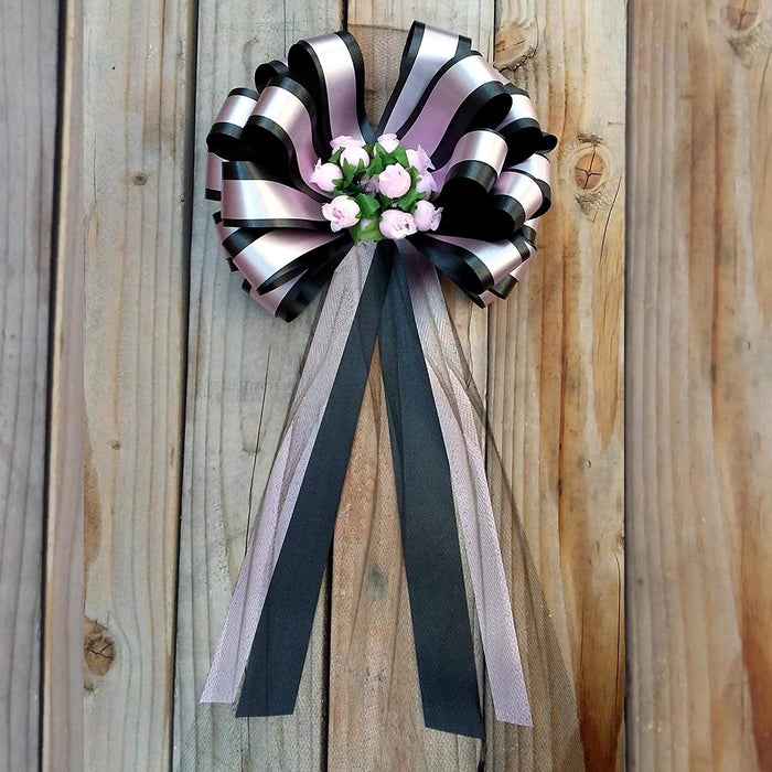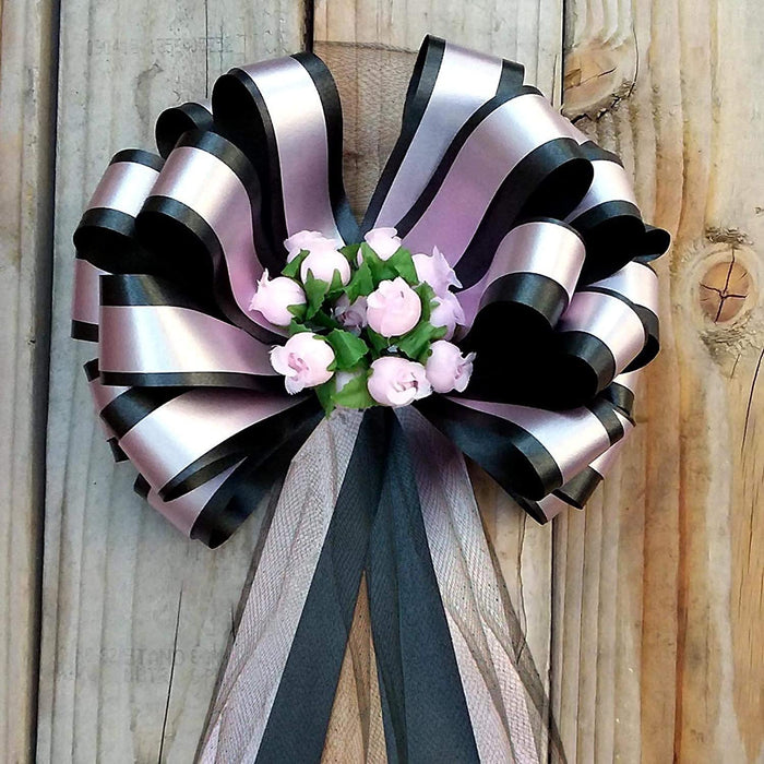 Pink and Black Striped Pull Bows with Tulle Tails and Rosebuds - 8" Wide, Set of 6