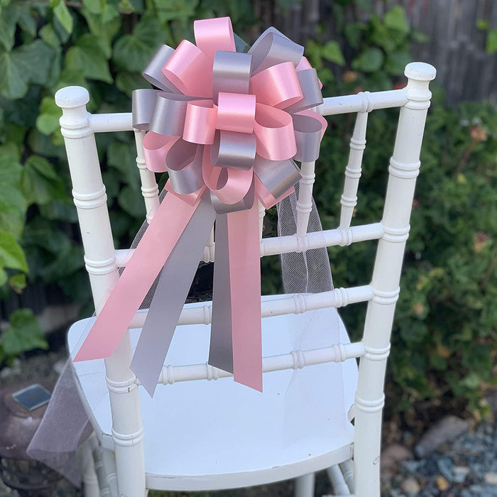 Pink and Silver Pull Bows with Tulle Tails - 8" Wide, Set of 6