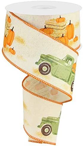 - Ribbon for Gift Wrapping - Rustic Green Antique Pickup Truck with Orange Pumpkins in the truck bed ribbon with orange wire edges in a roll 2.5 inch wide by 10 yds for all your fall and autumn Decorations!