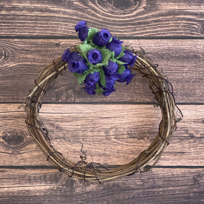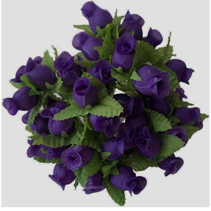 • 12 faux silk polyester Purple Rosebud mini bouquets, with 1.75" long, bendable stems and purple leaves for all your Arts, Crafts and DIY needs