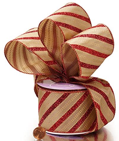 - Ribbon for Gift Wrapping - Holiday Wired Christmas Tree ribbon with red glitter stripes and Gold accent stripes on tan in a roll 2.5 inch wide x 10 yds for your Christmas craft