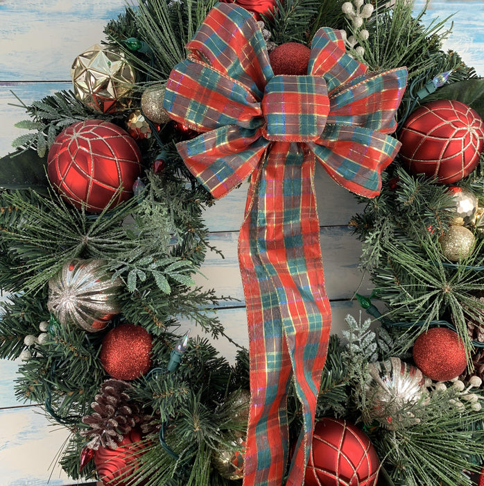 • Ribbon for Gift Wrapping - Rustic Red, Green and Gold Plaid Christmas Bow for Decoration - 10 inches wide and 18 inches long from top of the bow to the bottom of the tails