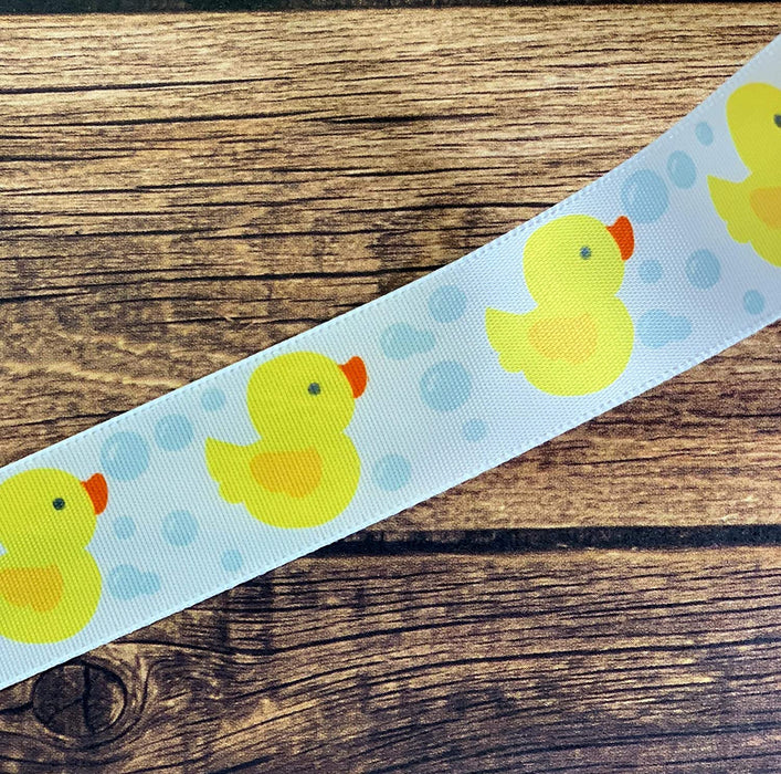 - Ribbon for Gift Wrapping - Cute White Satin ribbon decorated with a yellow rubber ducks pattern in a roll 1 inch wide by 25 yds for all your holiday crafts - Comprised of 100% Polyester