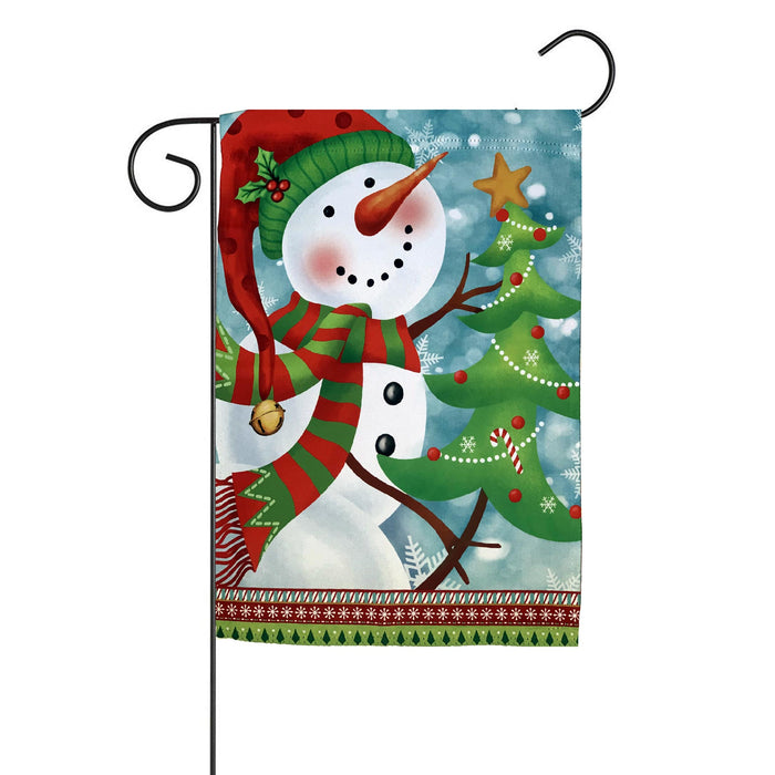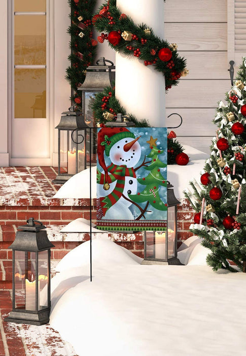 - Festive 12 inch by 18 inch Christmas garden flags are great for showing your jolly Christmas spirit! This Christmas Flag display a smiling white snowman with a red and green hat and scarf holding a decorating Christmas Tree above a red and green wrapping paper design