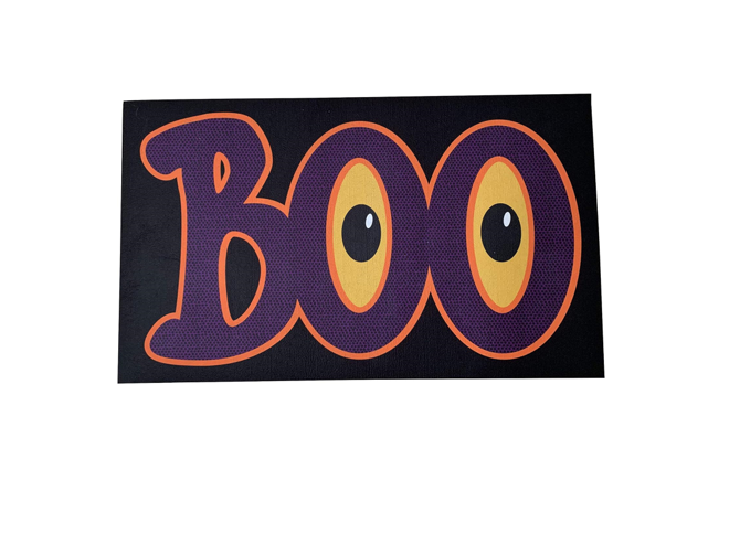 - 18" x 30" Halloween decor door mat that says BOO in big purple letters with an orange outline - Trick or Treat anyone?