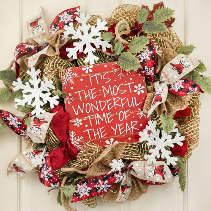 - It's the Most Wonderful Time of The Year in white text on rustic red fence slats with a Jute hanging rope to display - Sign comprised of MDF Wood with Printed Paper Text