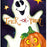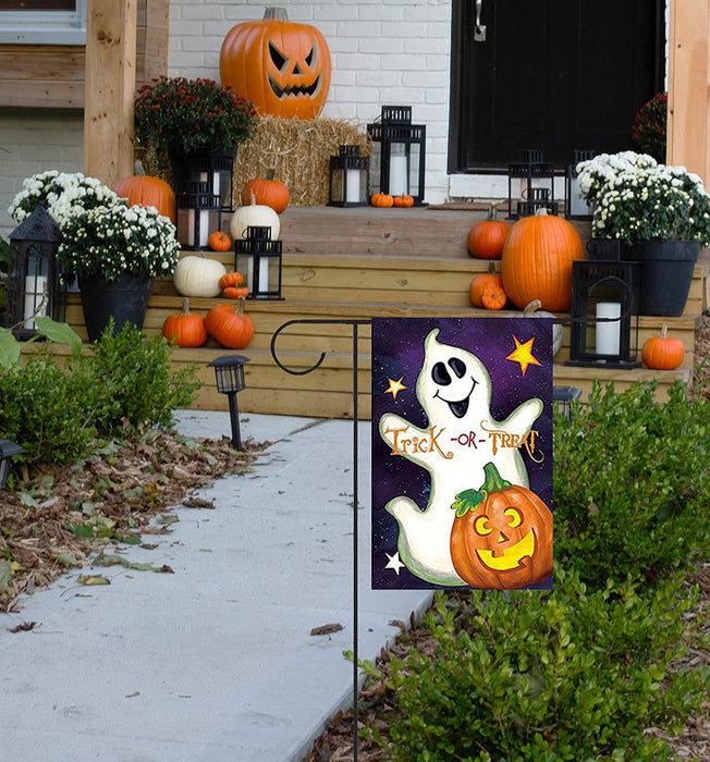 - 12 inch by 18 inch Halloween decor garden flag is great for showing your fun and ghoulish side. This black and blue starry night flag has a smiling White Ghost and glowing Orange Jack-O-Lantern with the invitation "Trick or Treat" in spooky text.