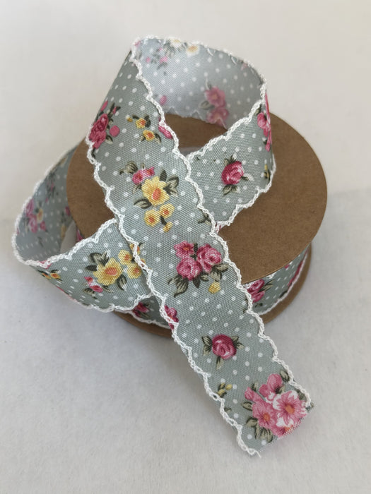 - Ribbon for Gift Wrapping - Classic farmhouse 1 inch x 10 yds ribbon with a pastel floral print on light blue gray ribbon with white polka dots and white embroidered edges - Comprised of 100% Polyester
