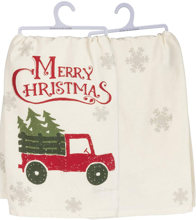 • This 28" x 28" Dish Towel is sure to catch eyes with their Seasonal Message, Bright Green Tree, Silver Snowflakes and Accenting Red Truck!