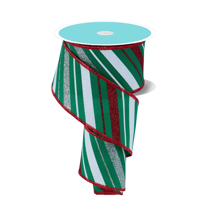 Christmas Diagonal Stripe Wired Ribbon - 2 1/2" x 10 Yards, Red, Green, Silver, White
