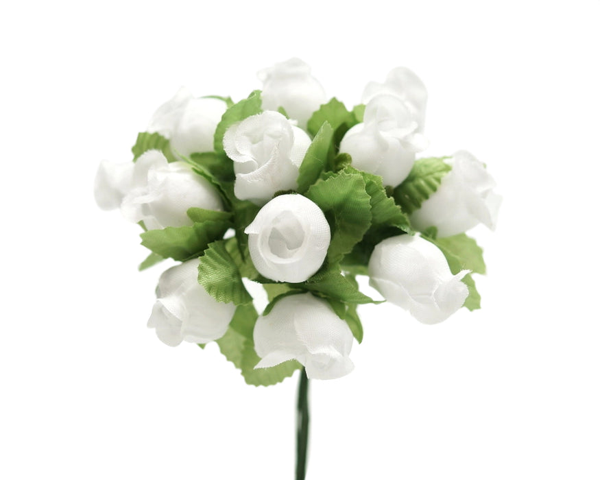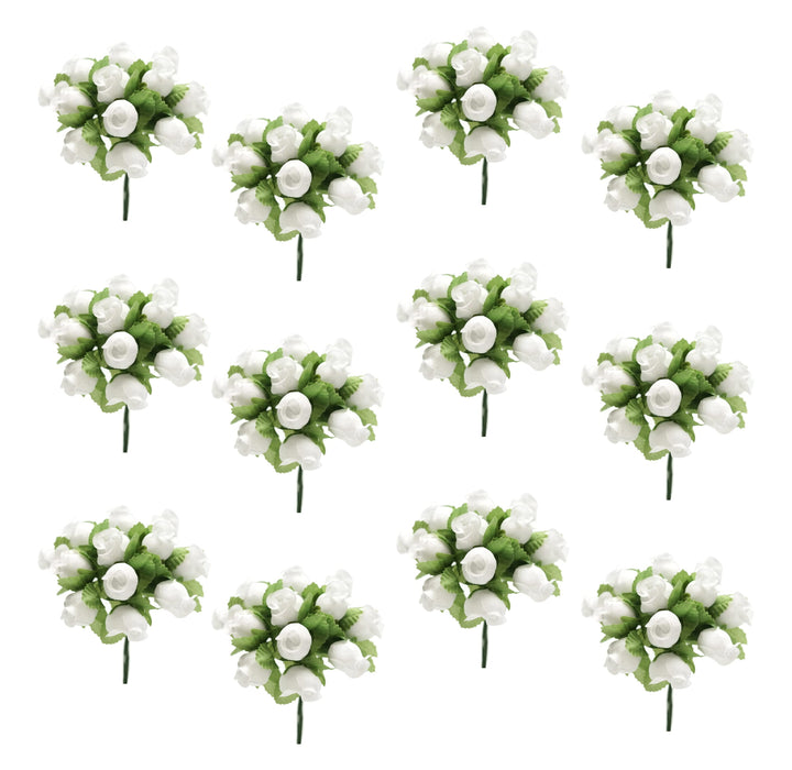 12 faux silk polyester White Rosebud mini bouquets, with 3" long, bendable green stems and leaves for all your Arts, Crafts and DIY needs