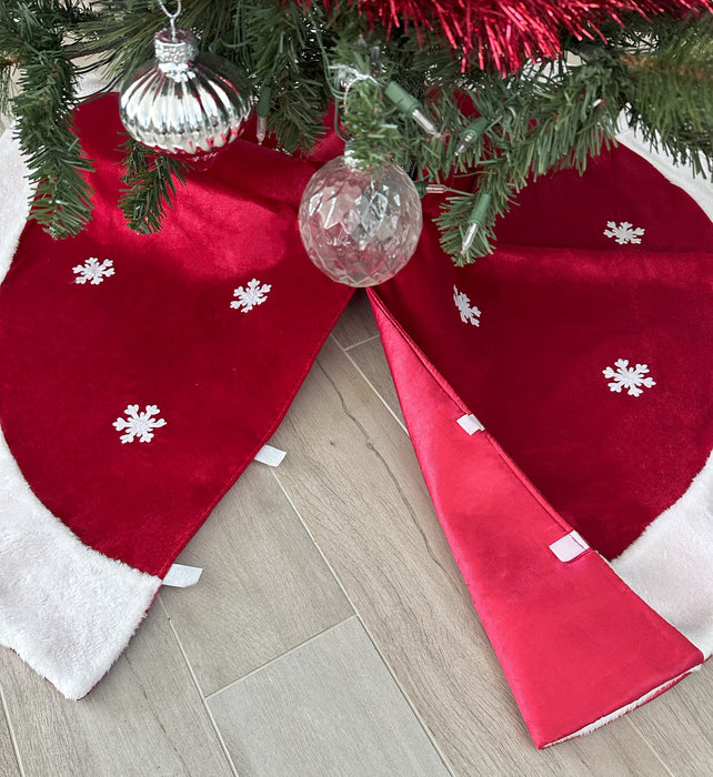 - Large Rustic Red Felt Christmas Tree Skirt - 48 Inch Wide (4 Feet) Diameter and fits Trees of all sizes and secures with easy Velcro Tabs!