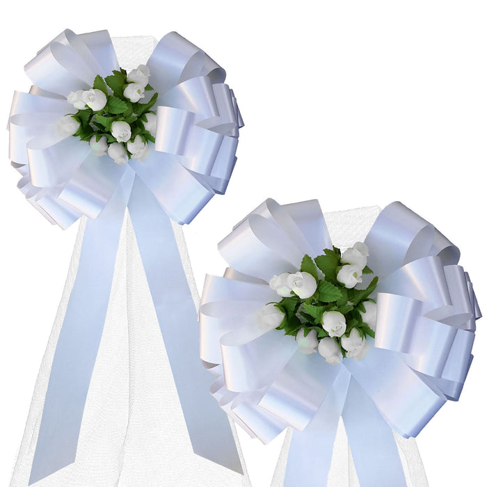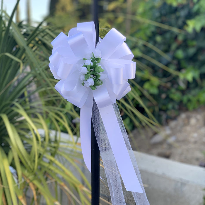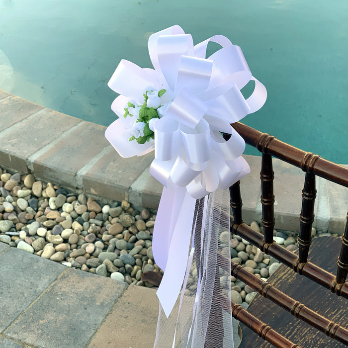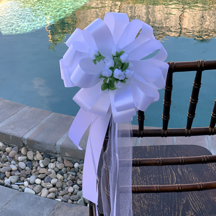 White Wedding Pull Bows with Tulle and Rosebuds - 8" Wide, Set of 6
